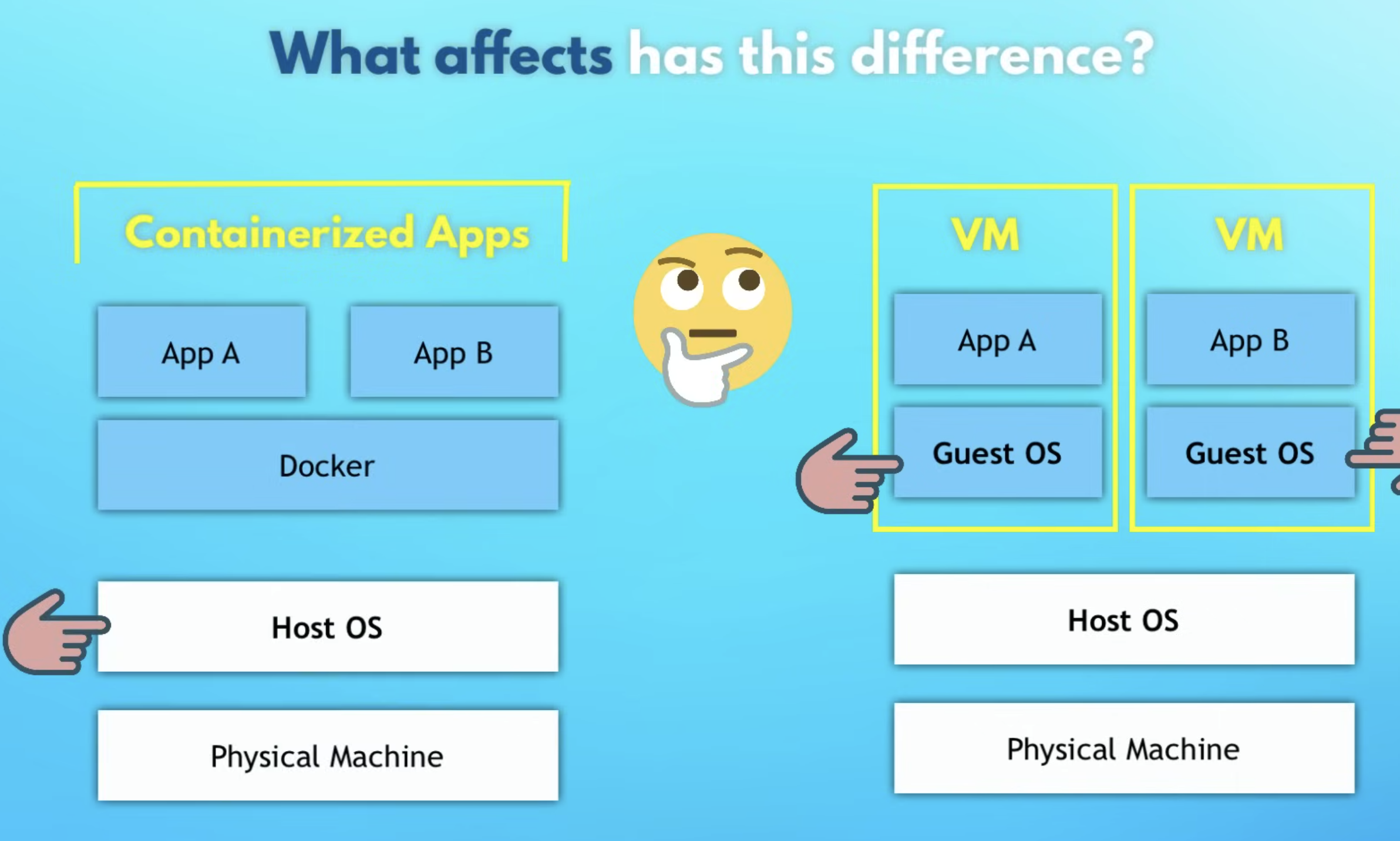 Docker vs VMs differs mainly in what gets virtualized: the whole OS, or just the application user space.