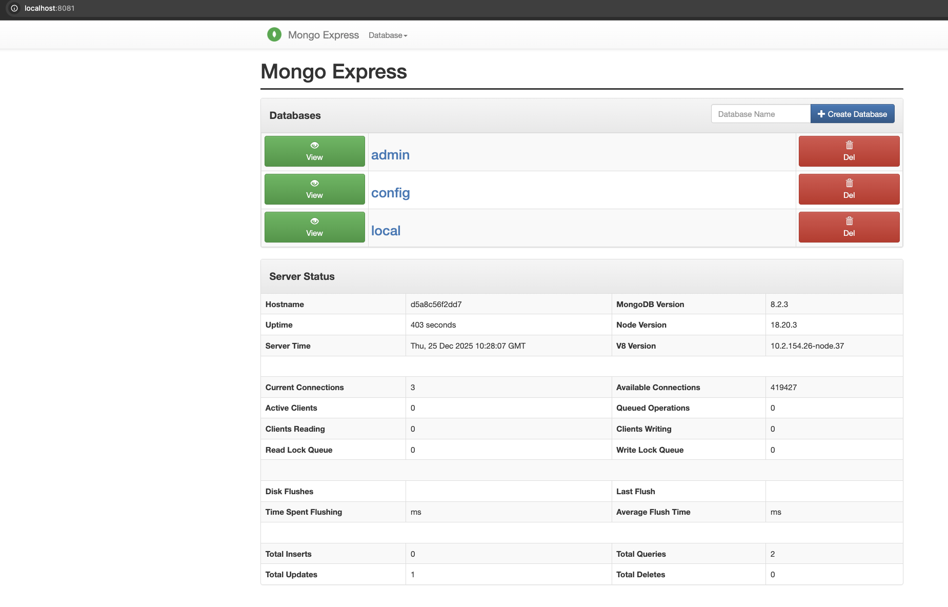 ade494422af5 mongo-express "/sbin/tini -- /dock…" 13 seconds ago Up 13 seconds 0.0.0.0:8081->8081/tcp, [::]:8081->8081/tcp mongo-express
