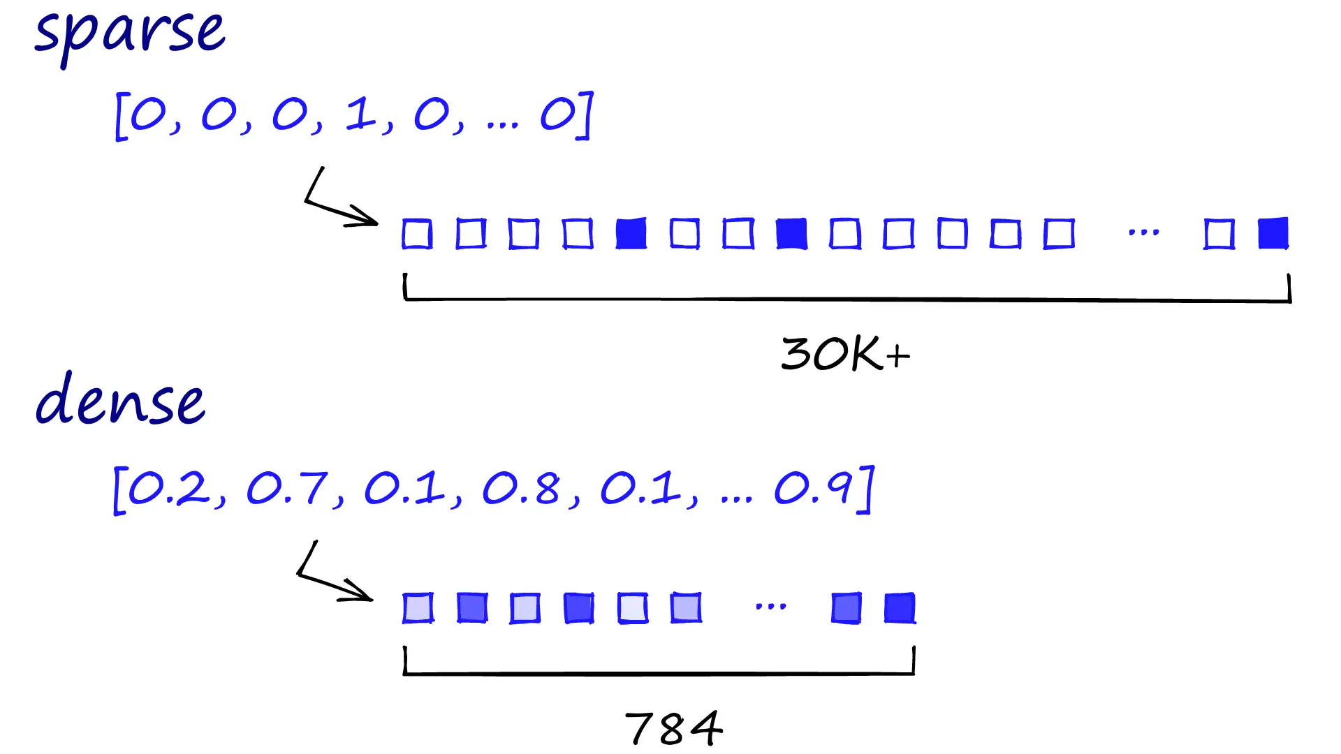 Sparse vectors are called sparse because vectors are sparsely populated with information. Typically we would be looking at thousands of zeros to find a few ones (our relevant information). Consequently, these vectors can contain many dimensions, often in the tens of thousands.