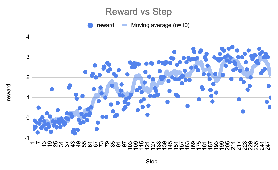 - Reward at each training step increases ⇒ Model reasoning and completion gets better over time.