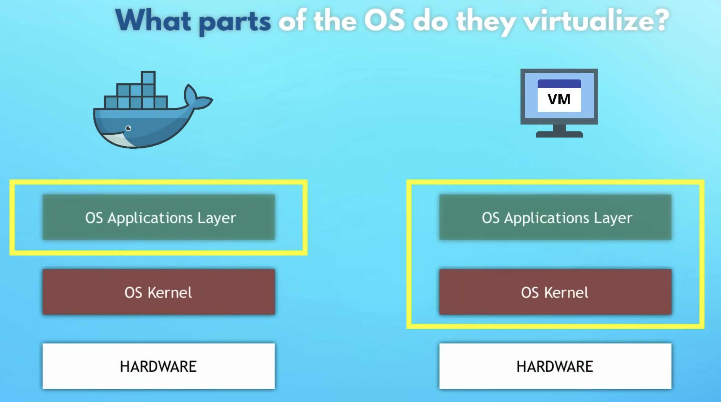 Docker vs VMs differs mainly in what gets virtualized: the whole OS, or just the application user space.