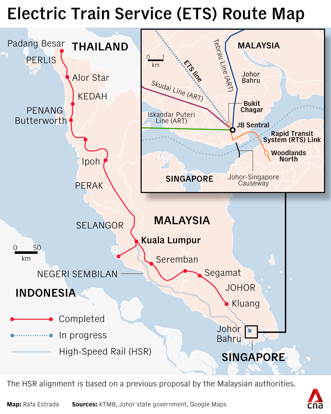 All a traveller from Singapore needs to do is head to the Woodlands North RTS station to clear immigration on both sides before taking a five-minute ride across the Johor Strait. Once at Bukit Chagar RTS station, the traveller can walk for less than five minutes to JB Sentral along a sheltered travellator where they can then board the ETS to KL Sentral. KTM said that the journey between Johor Bahru and Kuala Lumpur, for instance, would take between 3.5 and 4.5 hours, depending on type of ETS service the passenger takes - be it silver, gold, platinum or express - which has different number of stops and varying level of comfort.