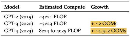 In a nut shell, GPT-2 to GPT-4 jump included 3.5-4 OOMs of compute gains over 4 years period (i.e., ~1 OOMs/year of compute efficiency).